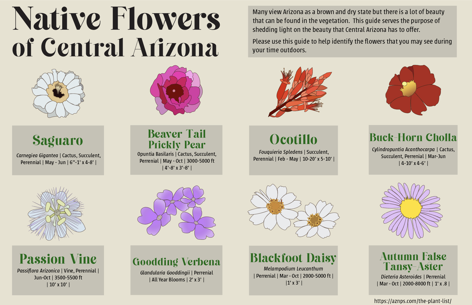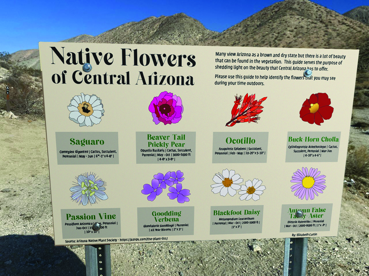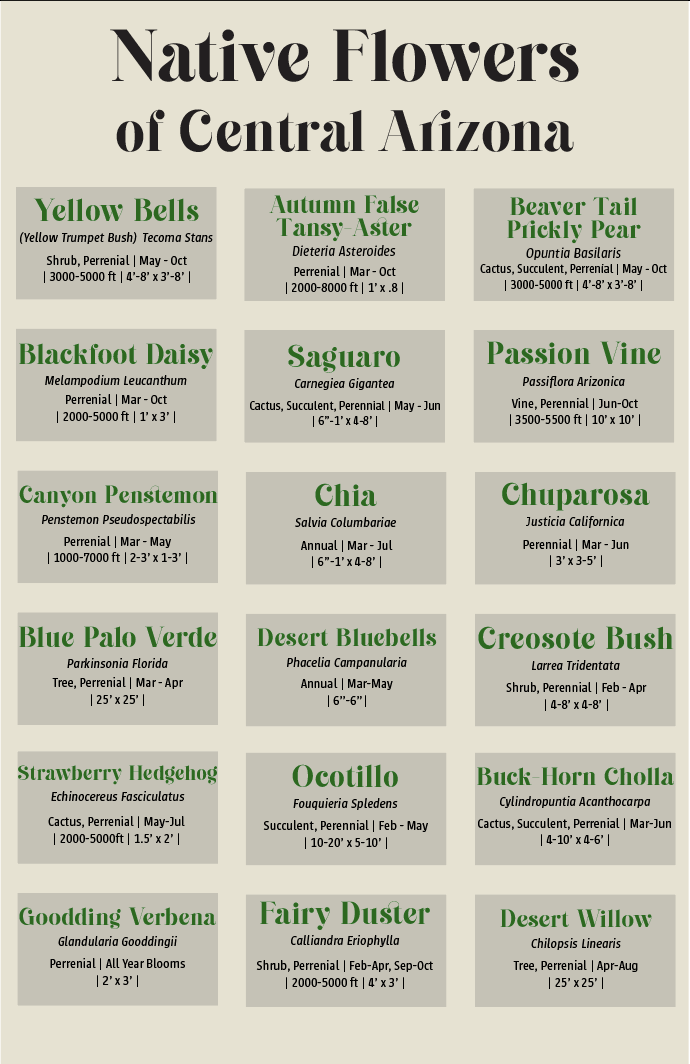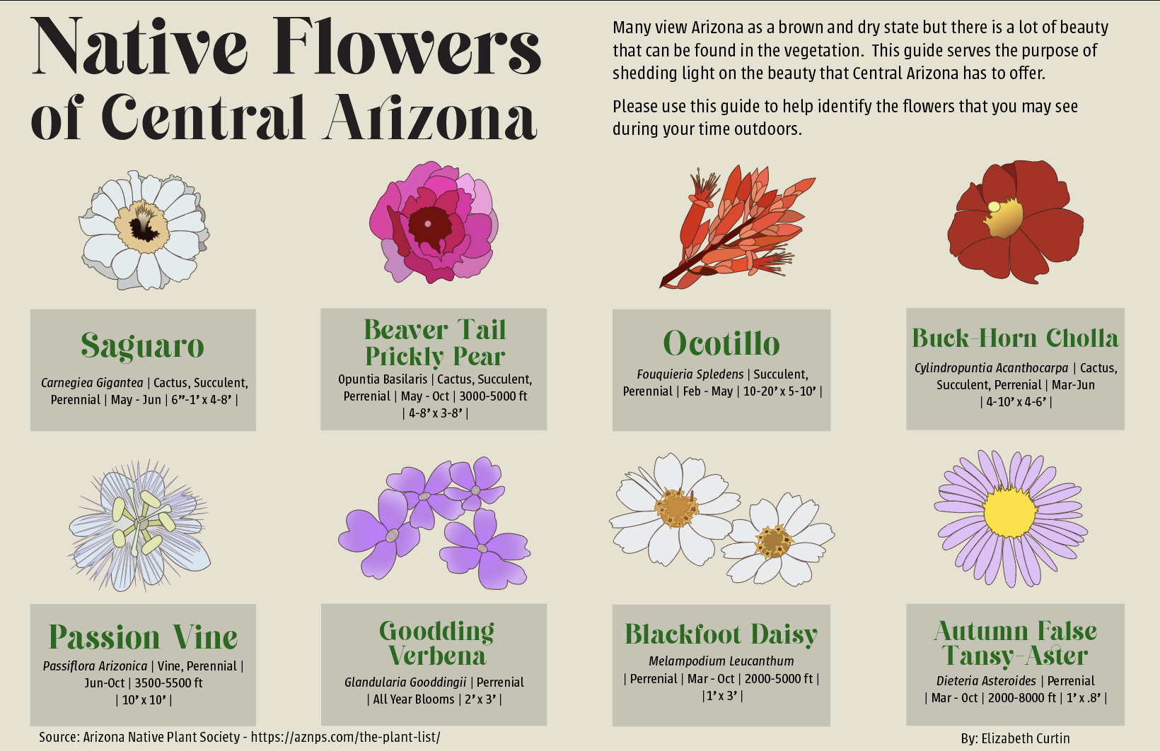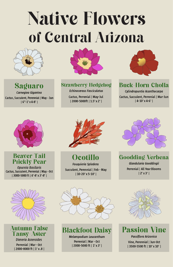 Many view Arizona as a brown and dry state but there is a lot of beauty in the vegetation and I wanted to shed light on the beauty. The goal was to create an informational poster that could be used as a reference to hikers and those who love to spend time outdoors in Arizona. The informational poster contains my drawings of each flower, descriptions of each flower, what time of year they bloom, and locations that they may grow in. Using information from the Arizona Native Plant Society as well as creating colorful yet accurate imagery of each flower helped bring this poster to life.