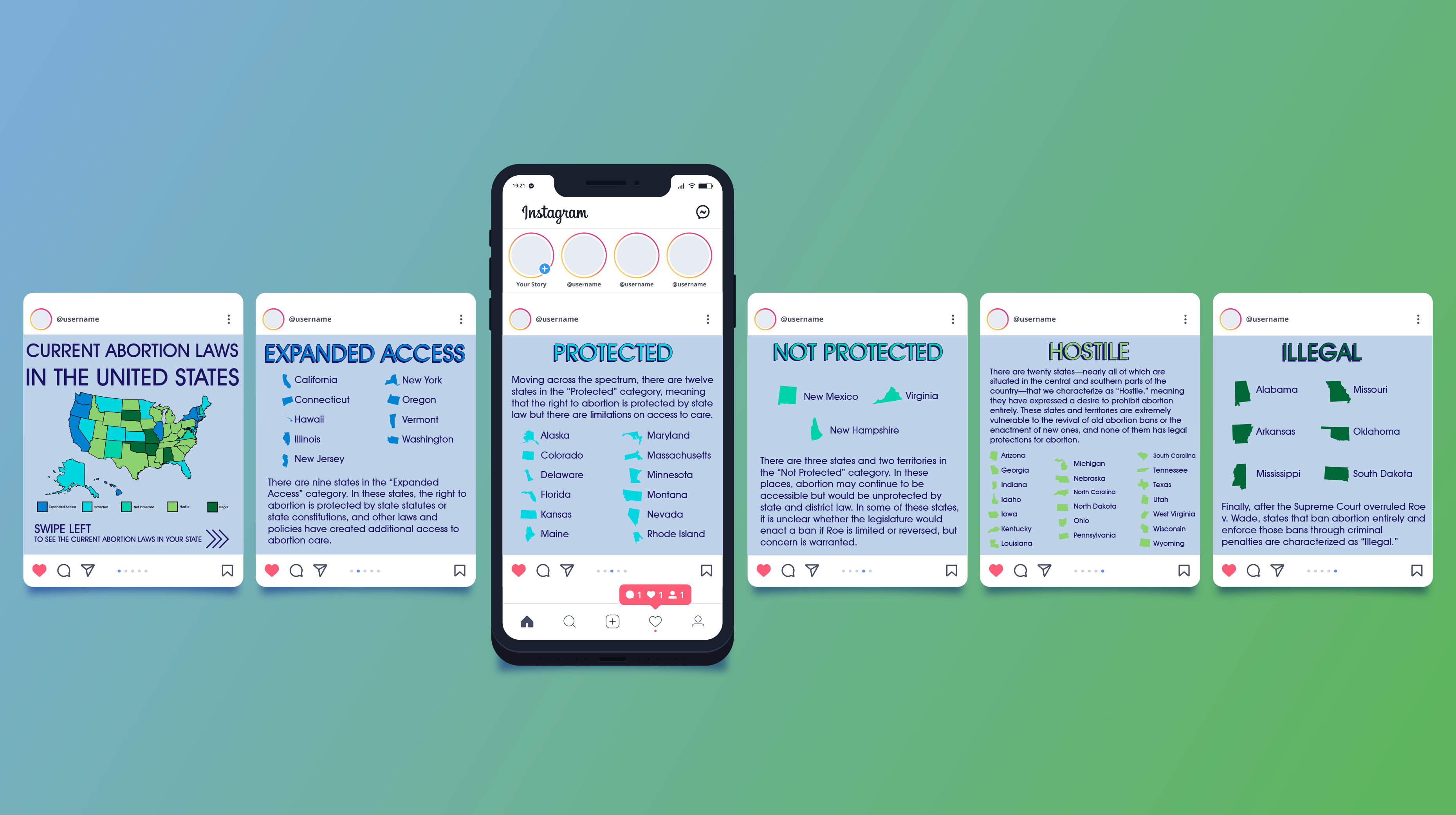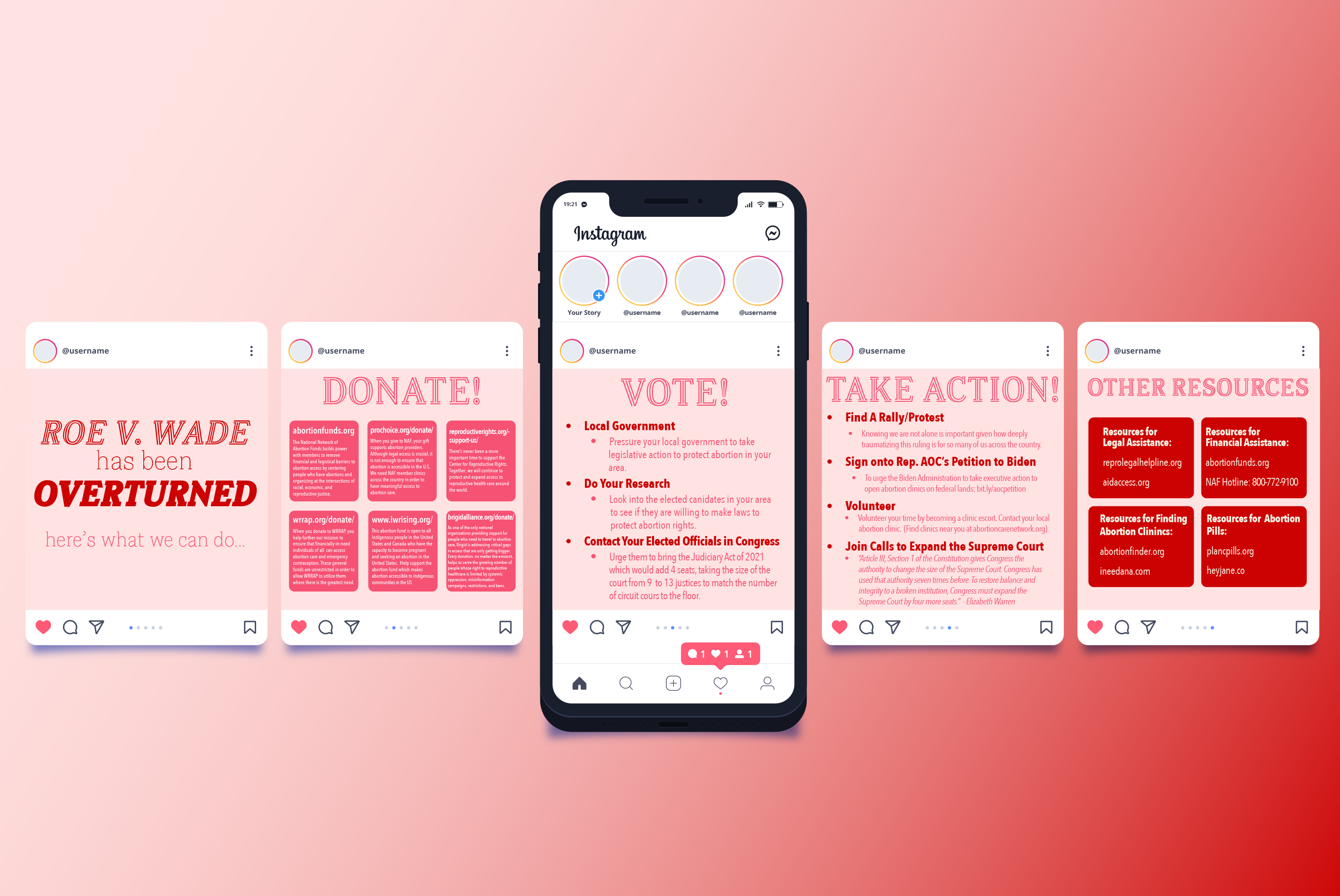 The overturning of Roe v. Wade caused a lot of controversy this past year as it took away healthcare rights from women. Instagram along with other social media platforms was a way to educate, inform, inspire, and/or motivate the public about all of the changes and events happening with reproductive healthcare in the United States. Working with a variety of resources for Roe v. Wade information such as the Center for Reproductive Rights and Planned Parenthood, I created a series of typography based Instagram posts to share information and resources on protecting and receiving reproductive healthcare services.